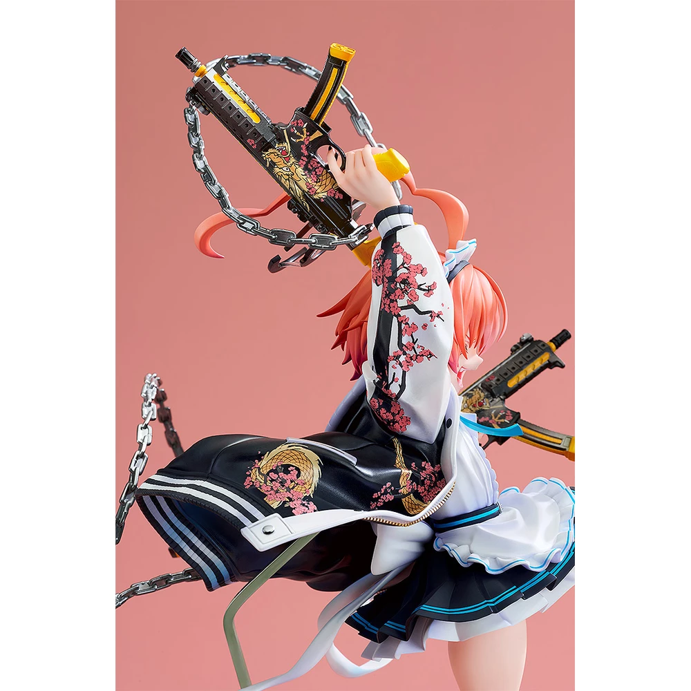 From the popular game "Blue Archive" comes a 1/7 scale figure of Neru, the leader of Millennium Science School's C&C! The figure has been carefully sculpted and painted to the finest details, capturing a snapshot of a moment Neru races freely through the battlefield with her guns Twin Dragon in hand. Neru's dynamic pose and determined smile work hand in hand to create a eye-catching and impressive figure. Neru's expression appears differently depending on the angle it is viewed from, allowing you to a multitude of ways to experience the excitement of the battle. The souvenir jacket she wears over her maid outfit has been carefully painted with pearlescent paint to recreate the unique textures of her outfit, including the embroidery on the back and sleeves. Twin Dragon, connected by chains, have also been faithfully sculpted for a realistic look. Be sure to add the invincible Neru to your collection!